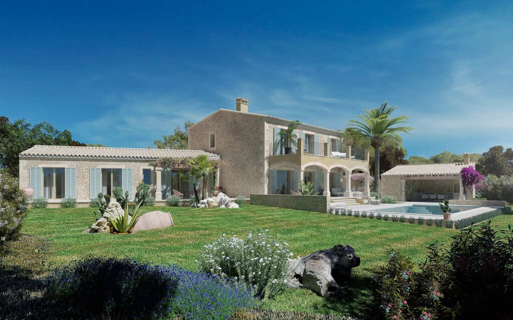 Renders para casa rural con diseño de jardines en Campos, Mallorca.