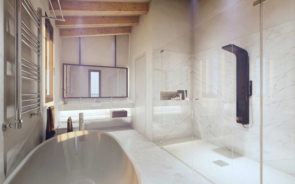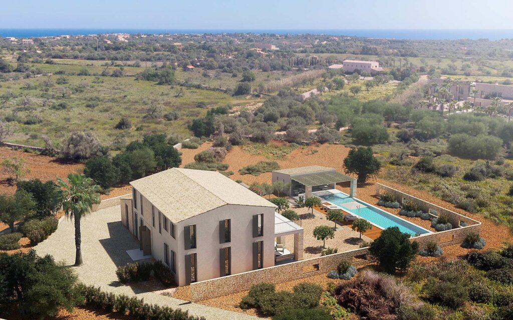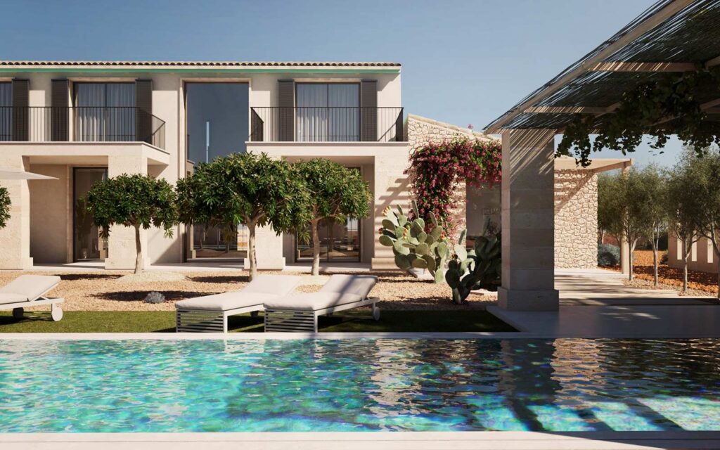 Renders exteriores e interiores con integración en fotografía real para vivienda rústica en Santanyí, Mallorca.
